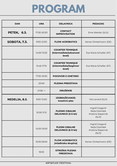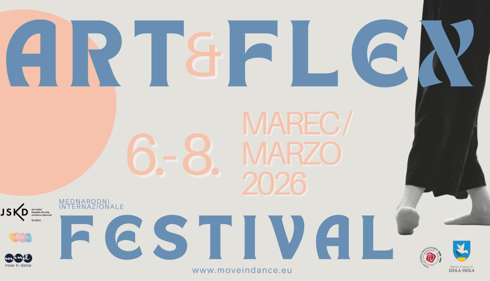 ART&FLEX FESTIVAL is a three-day international dance and movement festival taking place from 6 to 8 March 2026 in Izola. The event is designed for children, young people, and adults who wish to explore dance, movement, and physical expression through a variety of workshops, performances, and creative practices.