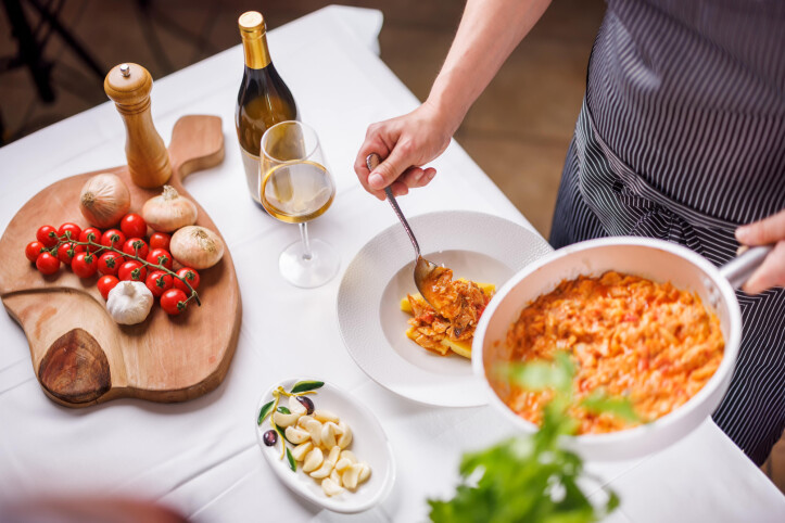 Scaldare l'olio d'oliva in una padella a fuoco medio, aggiungere la cipolla e l'aglio tritati e farli soffriggere finché saranno dorati e profumati. Aggiungere i pezzi di merluzzo e farli rosolare brevemente. Aggiungere i pomodori tagliati a cubetti, salare e pepare, versare il vino bianco e far sobbollire la salsa per circa 10-15 minuti per permettere ai sapori di combinarsi.