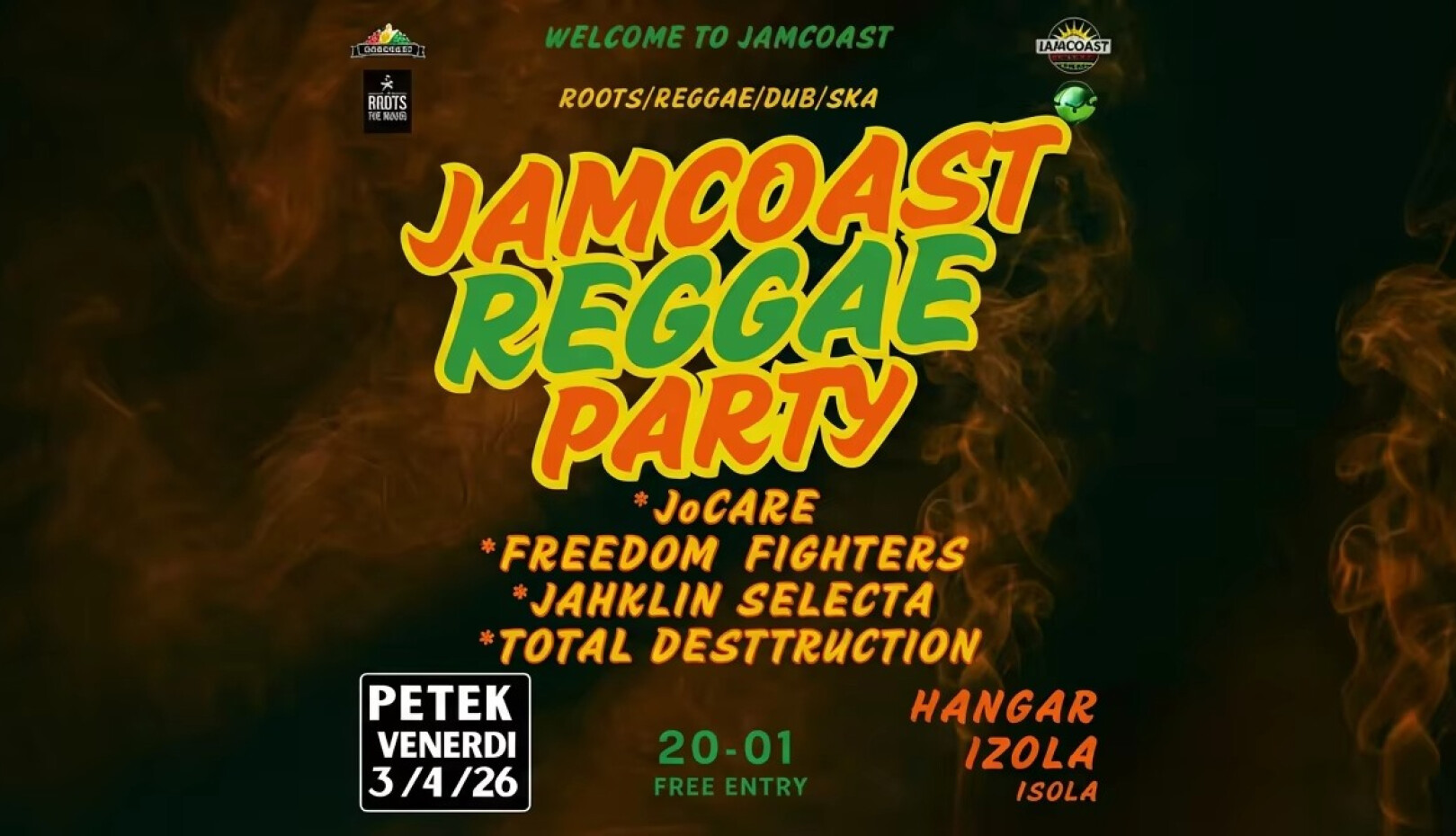 Jamcoast ekipa v sodelovanju z Hangar Bar pripravlja prvo letošnje pomladansko REGGAE druženje, ki bo zaznamovalo začetek toplejših dni v ritmih dobre glasbe, sproščenega vzdušja in pozitivne energije.