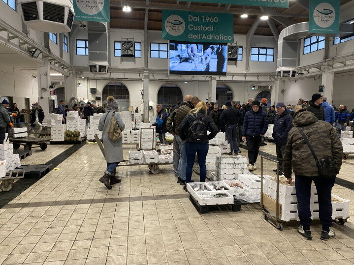 Med zanimivejšimi je bil obisk ribje tržnice Chioggia Pesca, ki že od leta 1960 velja za eno ključnih središč za skladiščenje, prodajo in obdelavo morskih dobrot v Italiji. Posebnost tržnice je tradicionalna vrsta prodaje imenovana asta all’orecchio – nekakšna tiha dražba, kjer kupci ceno zašepetajo dražitelju, ta pa svoj ulov proda najboljšemu ponudniku. Na obisku tržnice je izstopala tudi inovativna rešitev za obvladovanje velike količine stiropornih zabojev. Te zmeljejo in stisnejo v kompaktne kvadre, ki jih nato uporabijo za proizvodnjo novih recikliranih zabojev.