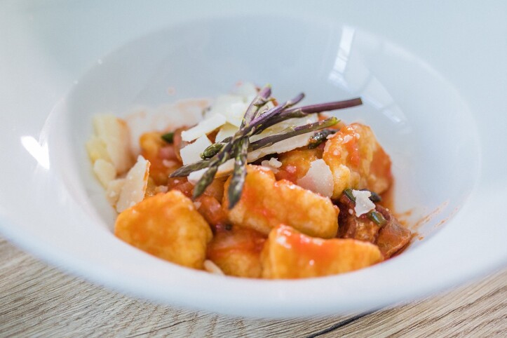 Njoki s šparglji in domačo klobasico